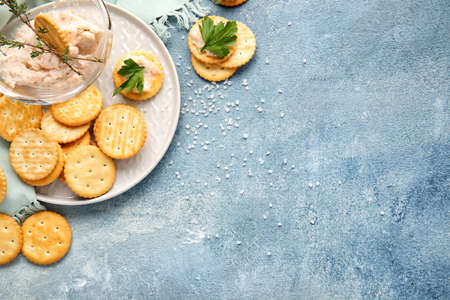 Small crackers mix of different shapes in plate on blue wooden background, top view