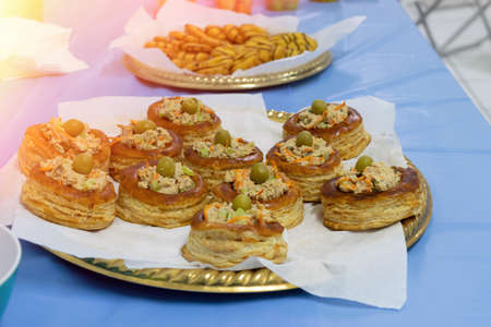 salty canapes of buns with tuna and olives on dessert table. catering