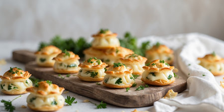 AI Generated. Homemade Mini Cheese Puff Pastries with Herbs and Flaky Phyllo Dough Freshly Baked for Delicious Appetizers or Snack Treats