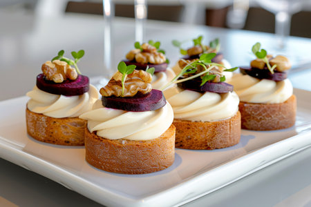 Catering appetizers featuring whipped cream cheese, beets, walnuts and microgreens on toasted baguette slices, ready to be served
