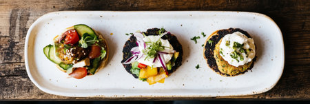 An appealing arrangement of vibrant appetizers on slices of toasted bread, topped with creamy spreads and garnished with fresh herbs, perfect for parties and gatherings.