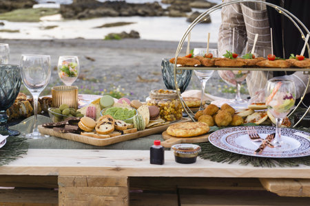 A picnic table full of appetizing foods, wonderful evening on the sunny beach