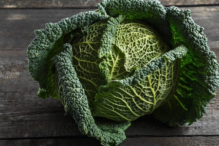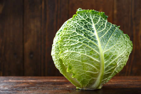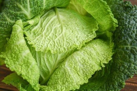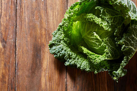 Raw savoy cabbage on a wooden background