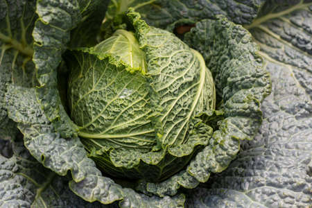Detail of fresh ripe head of savoy cabbage (Brassica oleracea sabauda) with lots of leaves growing in homemade garden. Close-up. Organic farming, healthy food, BIO viands, back to nature concept.
