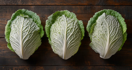 Three fresh green cabbages are perfectly aligned on a rustic wooden table, showing their vibrant leaves and textured surfaces, ideal for healthy meal preparation or fresh produce display.
