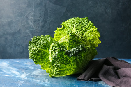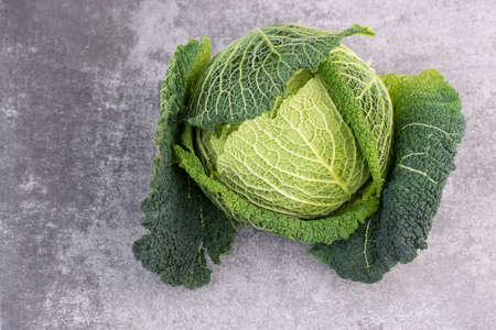 Fresh green savoy cabbage on a gray structured background