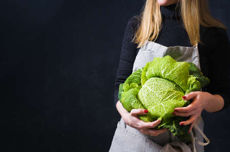The chef is holding Savoy cabbage. Dark background, side view, space for text
