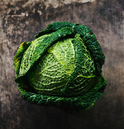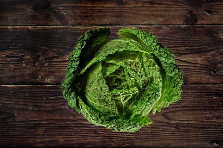 Plan view of savoy cabbage on wooden table