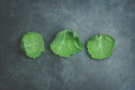 three organic, vitamin-rich and crunchy Savoy cabbage leaves on a gray background. perfect for diet-related illustrations