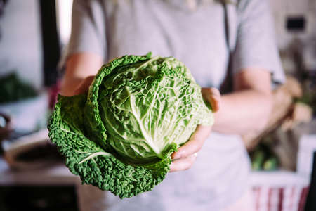 Hands holding savoy cabbage. Healthy eating concept.