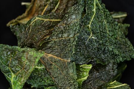 green leaves detail of savoy cabbage on black background