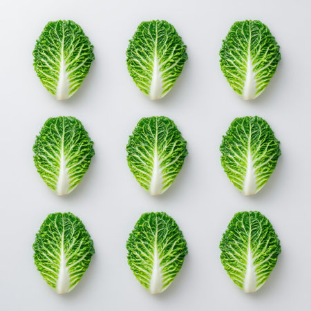 Bright fresh cabbage leaves are arranged in a neat grid on a light background, showcasing their vibrant green colors for healthy cooking inspirations.