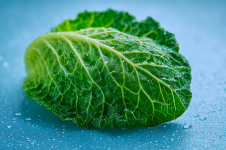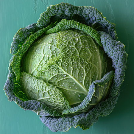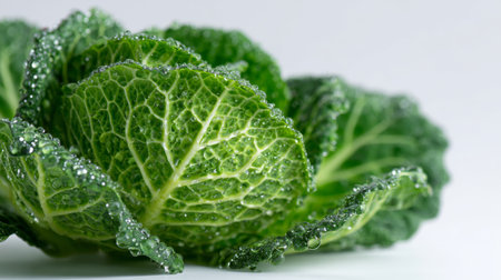 Close-up of fresh green cabbage leaves adorned with shimmering water droplets, showcasing crisp texture and vibrant color for healthy lifestyle concepts.