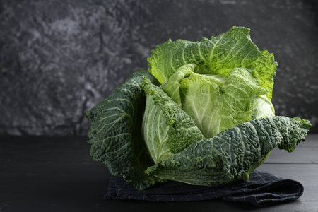 Fresh ripe Savoy cabbage on black wooden table, closeup