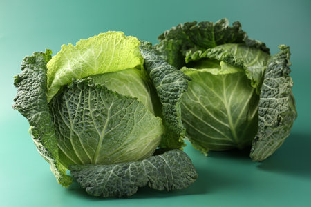 Fresh Savoy cabbages on teal background, closeup