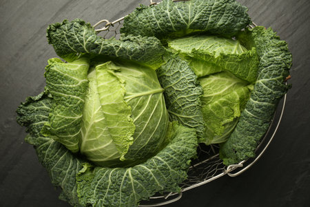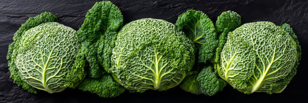 Five Green Savoy Cabbages on Black Stone Background, Culinary and Fresh Produce Concept