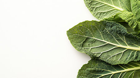 Fresh kale leaves layered on top of each other on a white background, showcasing their vibrant green colors and healthy appearance.