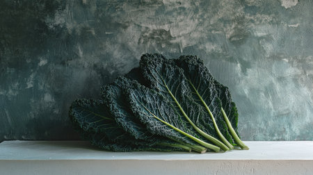 Palm kale leaves stacked neatly on a white surface, their textured surfaces and dark green tones creating a bold and healthy visual.