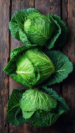 Three vibrant green cabbages are placed on a rustic wooden table, showing their crisp leaves and rich texture. Ideal for salad or cooking, they add freshness to any dish.