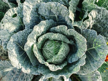 Image of Savoy cabbage in organic autumn garden.