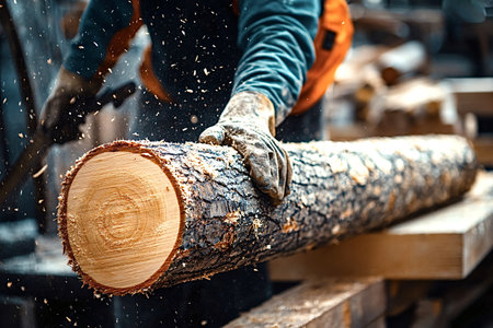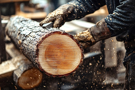 Carpenter wearing protective gloves measures a freshly cut tree trunk with a saw, with sawdust flying through the air, highlighting the craftsmanship