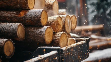 Logs are being processed at a sawmill, showcasing the timber industry and wood production