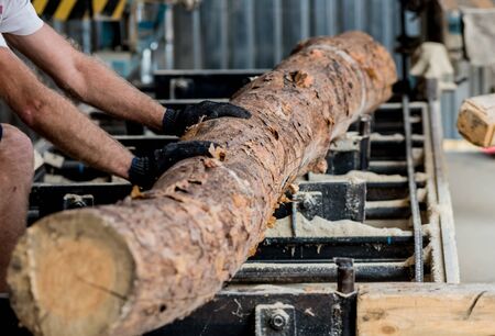 Carpenters working on a production line processing timber logs in a sawmill, ensuring quality and efficiency in lumber production