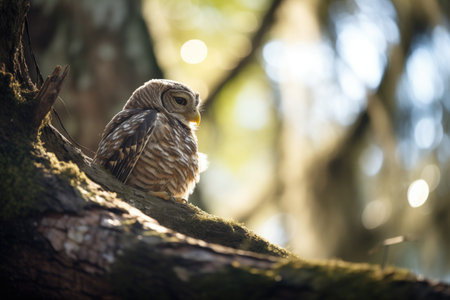 An enchanting owl sits gracefully on a moss-covered log, surrounded by lush green foliage and soft, diffused light in the forest.