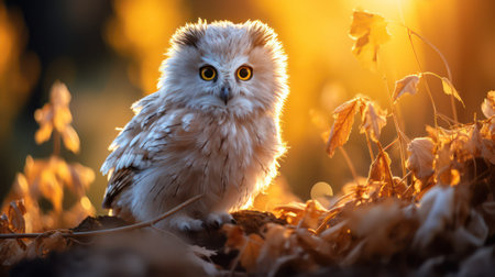 Intense Gaze of a Forest Owl Amid Autumn Leaves