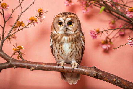 Beautiful owl sitting on a branch with pink flowers on a pink background