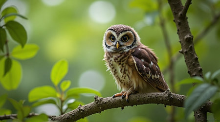 This enchanting close-up captures an adorable owl perched gracefully on a branch, surrounded by vibrant green leaves and gentle sunlight, creating an inviting, serene atmosphere.