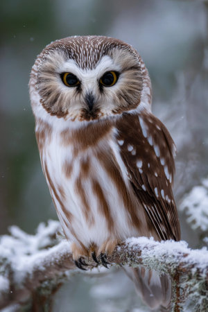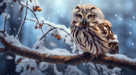 A captivating snowy owl sits peacefully on a snow-laden branch, surrounded by a serene winter landscape. Gentle snowflakes fall around, creating a tranquil atmosphere.
