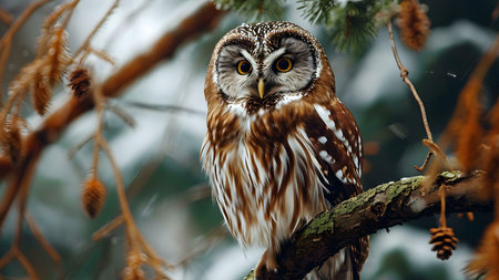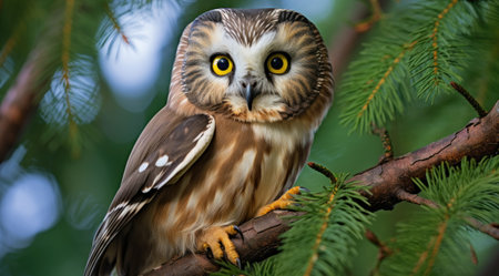 northern saw-whet owl perched on a pine tree, created with generative ai