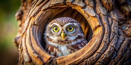 Adorable Owl Peeking from Tree Hole - Wildlife Stock Photo