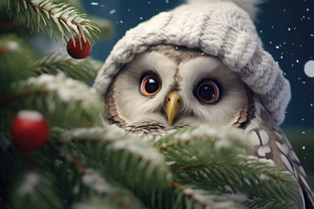 A charming owl dons a Santa Claus hat, perched amidst the dense spruce branches