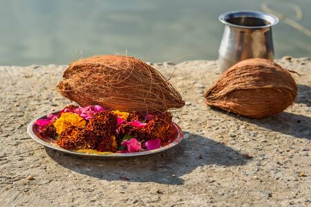 Flower and coconut for Hindi ritual at Pushkar holy lake in Rajasthan. India