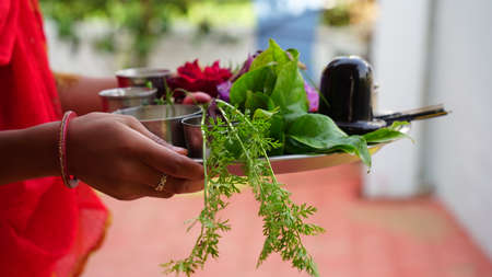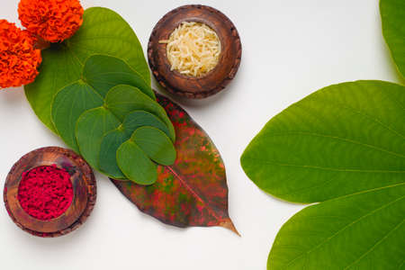 Indian festival dussehra , green leaf, rice and flowers