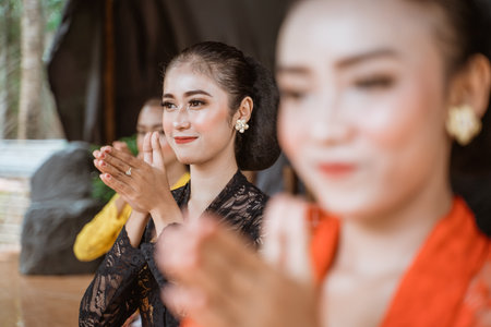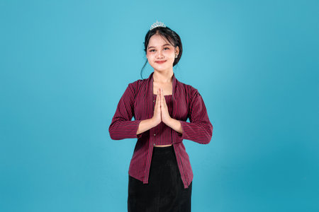 Smiling young Asian woman in traditional striped lurik attire with hands in greeting gesture. Her soft, confident expression radiates warmth, respect, and cultural pride.