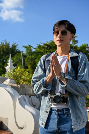 Portrait, Handsome young Asian male tourist wearing sunglasses and jean jacket, putting his hands together in a prayer position in the temple.