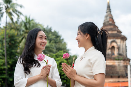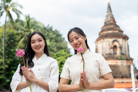 Two beautiful Asian women in traditional Northern Thai-Lanna dresses stand in a temple, holding pink lotuses and smiling at each other. Thai culture, Asia traveling, Buddhist Holidays