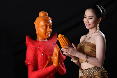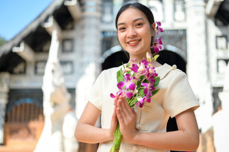 Attractive Thai woman in an ancient Thai dress holds a fresh flowers paying homage to Buddha to make a wish on the traditional Songkran festival in Thailand
