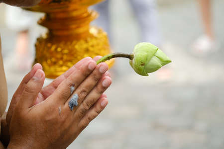 Respect hands with lotus with some hair that shave by monk, this a part of the Ceremony to be buddhist monk.