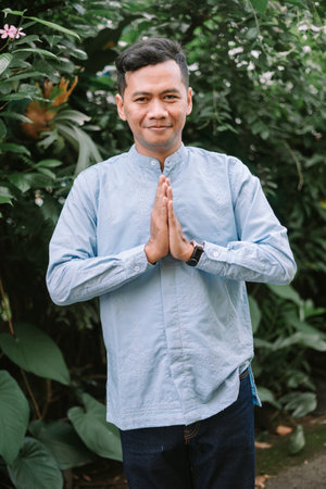 Portrait of a smiling Asian man expressing gratitude or giving a traditional greeting with hands pressed together in front of lush, green foliage. He is wearing a casual blue shirt and jeans, conveying a sense of peace, respect, and cultural awareness.