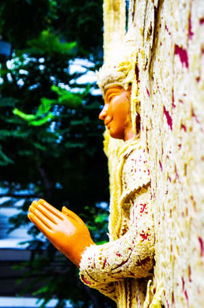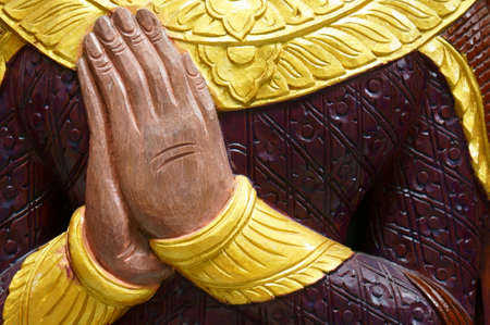 Close up photo of wai the traditional thai greeting method appeared on a gold painted statue in Wat Prakaew Bangkok Thailand