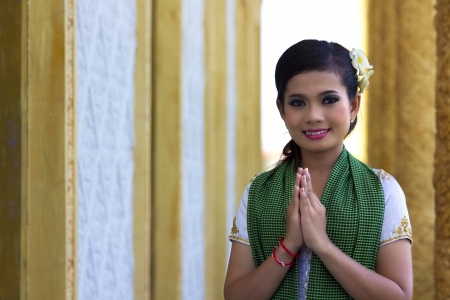 Myanmar women holding flowers at a temple. Southeast Asian young girls with burmese traditional dress visiting a Buddihist temple.