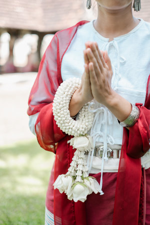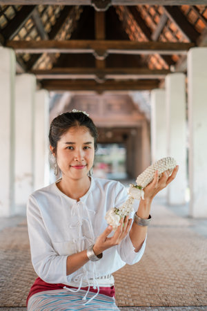 Attractive Thai woman in an ancient Thai dress holds a garland of fresh flowers paying homage to Buddha to make a wish on the traditional Songkran festival in Thailand