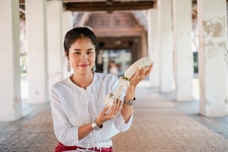 A woman in traditional Thai attire holds a jasmine garland, showcasing cultural heritage and elegance in a serene architectural setting.