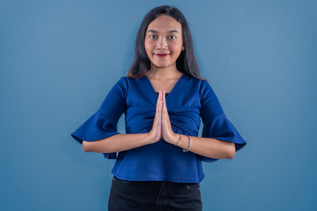 Young Asian woman smiling and performing a traditional greeting gesture with palms together, symbolizing respect, gratitude, and peace. Studio portrait on blue background.