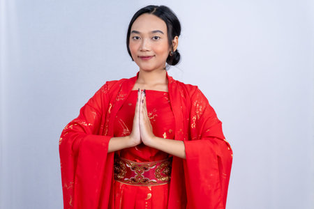 A woman in a red Chinese dress presses her palms together against a simple white studio background