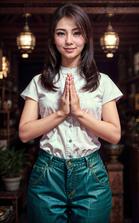 asian woman do sawasdee or prayer pose at the market, generative AI